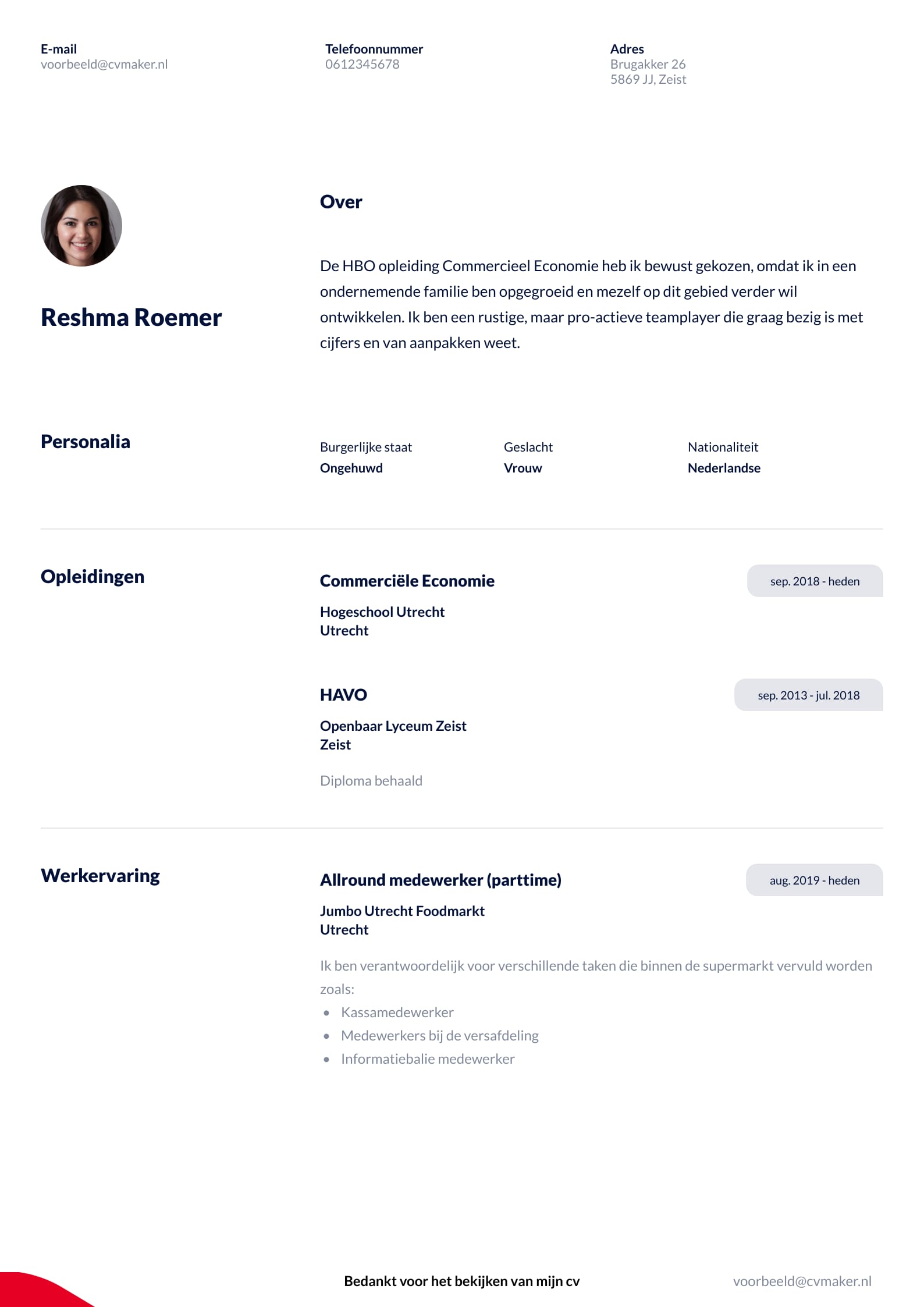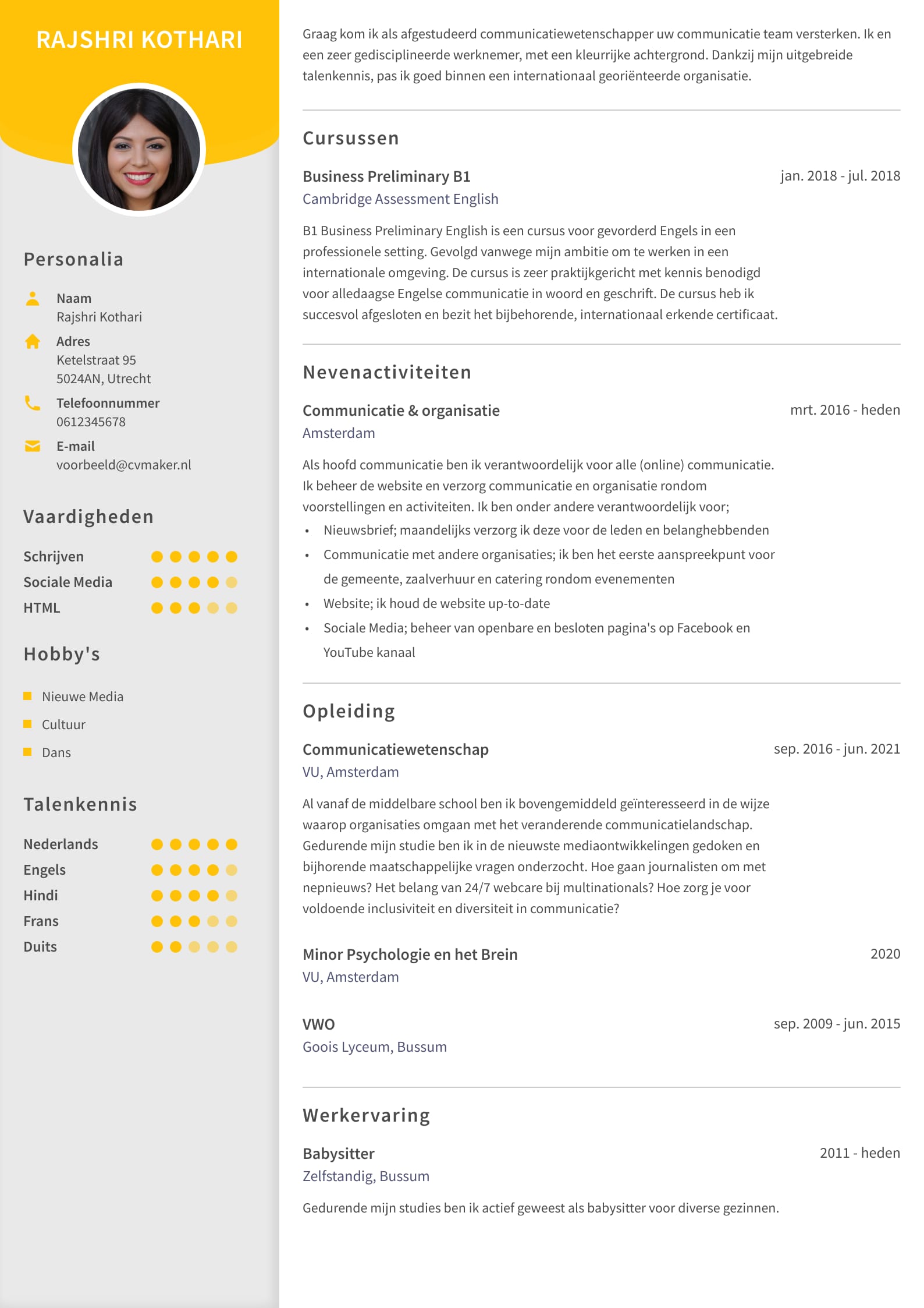 Deze cv-sjabloon is perfect als je pas bent afgestudeerd en je carrière wilt beginnen met een stage. De cv zonder werkervaring in dit voorbeeld is lekker duidelijk. Dankzij het compacte formaat van één pagina en de overzichtelijke lay-out wordt snel zichtbaar wat je te bieden hebt.