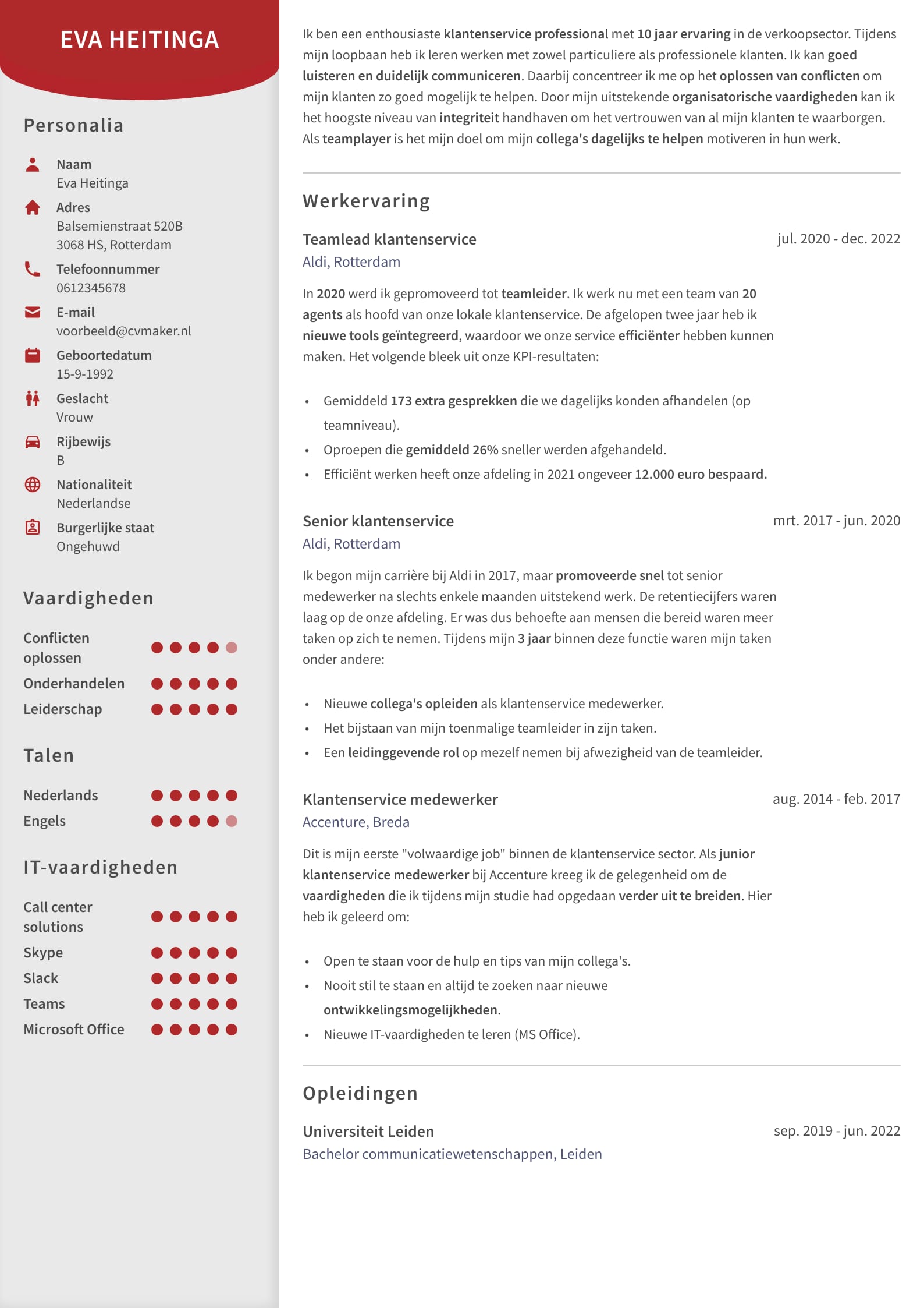 Als klantenservice medewerker ga je waarschijnlijk dagelijks veel praten en contact hebben met anderen. Probeer je motivatiebrief kort en bondig te houden. Benoem twee tot maximaal drie belangrijke en relevante vaardigheden en bewaar de rest voor een eventueel kennismakingsgesprek.